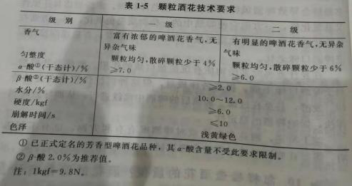 要按照國家統一的標準來檢查酒花的質量,國家標準(GB10347.1—89)分別對片狀酒花和顆粒酒花作了技術要求,見表 1-4、表1-5。" />