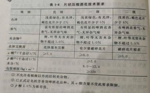 要按照國家統一的標準來檢查酒花的質量,國家標準(GB10347.1—89)分別對片狀酒花和顆粒酒花作了技術要求,見表 1-4、表1-5。